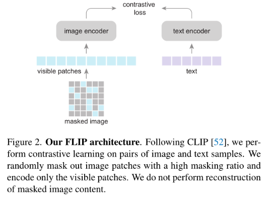 image encoder采用ViT-L/16,mask patches ratio为50%、75%。mask50%(或者75%)可以将Vit编码的时间复杂度减低1/2(或者1/4)。在同内存成本下,可以采用2* (或者4*)的batch size。