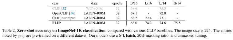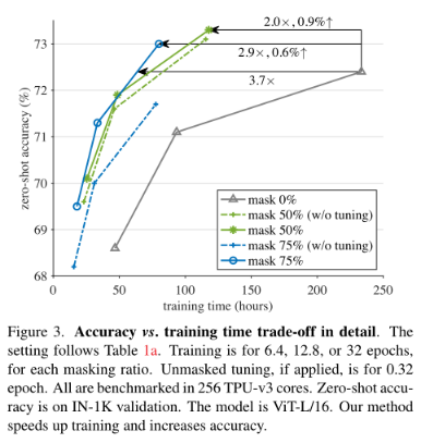 FLIP明显比CLIP有更好的权衡。达到与CLIP相似的精度,同时享受>3×的加速。在相同的32 epoch下,FLIP比CLIP方法的准确率高约1%,速度快2倍(mask 50%)