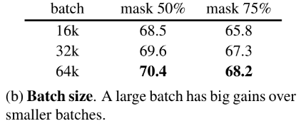Batch size. 在上面(a),mask 50%时精度acc有提升,可能是batch_size带来的增益。因此有实验: