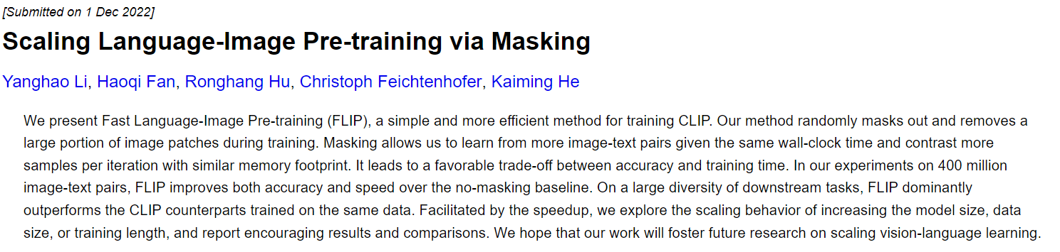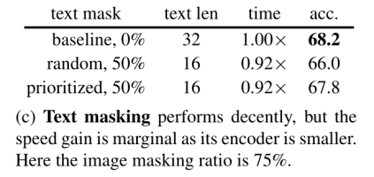 总体速度增益很小。这是因为文本编码器更小,文本序列更短。与图像编码器相比,文本编码器的计算成本仅为4.4%(没有屏蔽)。在这种设置下,文本屏蔽不是一种值得的权衡,在其他实验中没有屏蔽文本。因此这里只对image masking。