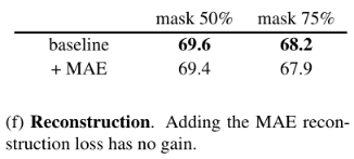Reconstruction. 添加一个重构损失函数。遵循MAE:小的解码器和重建归一化图像像素。将重构损耗加到对比损耗中。