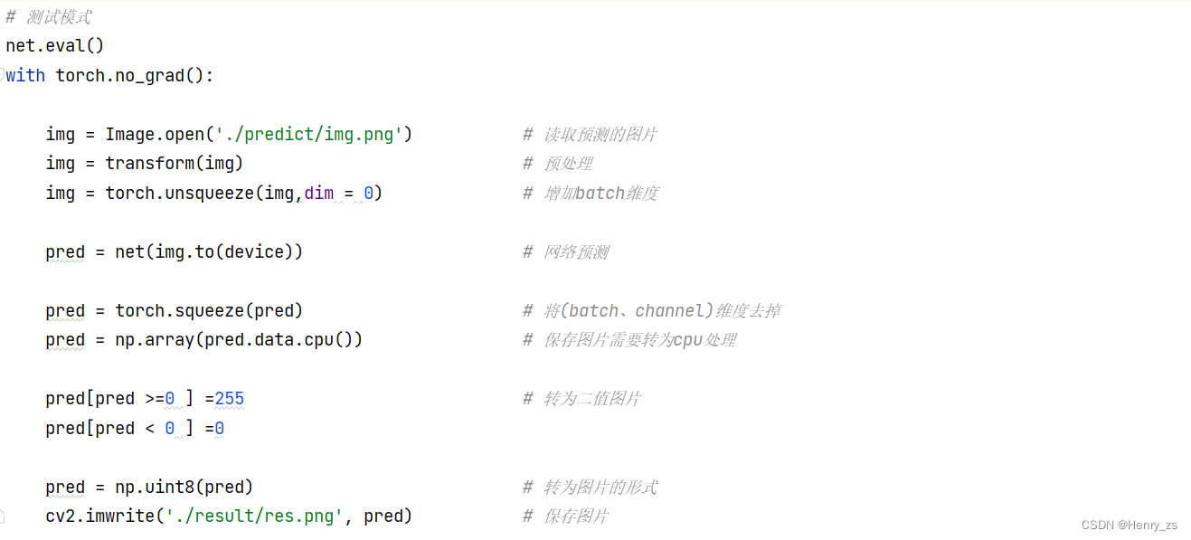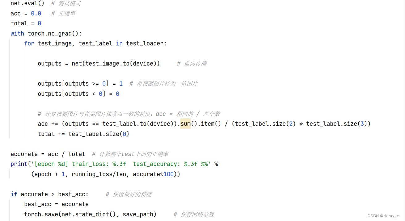 for epoch in range(20):net.train() # 训练模式running_loss = 0.0for image,label in train_loader:optimizer.zero_grad() # 梯度清零pred = net(image.to(device)) # 前向传播loss = criterion(pred, label.to(device)) # 计算损失loss.backward() # 反向传播optimizer.step() # 梯度下降running_loss += loss.item() # 计算损失和net.eval() # 测试模式acc = 0.0 # 正确率total = 0with torch.no_grad():for test_image, test_label in test_loader:outputs = net(test_image.to(device)) # 前向传播outputs[outputs >= 0] = 1 # 将预测图片转为二值图片outputs[outputs < 0] = 0# 计算预测图片与真实图片像素点一致的精度:acc = 相同的 / 总个数acc += (outputs == test_label.to(device)).sum().item() / (test_label.size(2) * test_label.size(3))total += test_label.size(0)accurate = acc / total # 计算整个test上面的正确率print('[epoch %d] train_loss: %.3f test_accuracy: %.3f %%' %(epoch + 1, running_loss/len, accurate*100))if accurate > best_acc: # 保留最好的精度best_acc = accuratetorch.save(net.state_dict(), save_path) # 保存网络参数