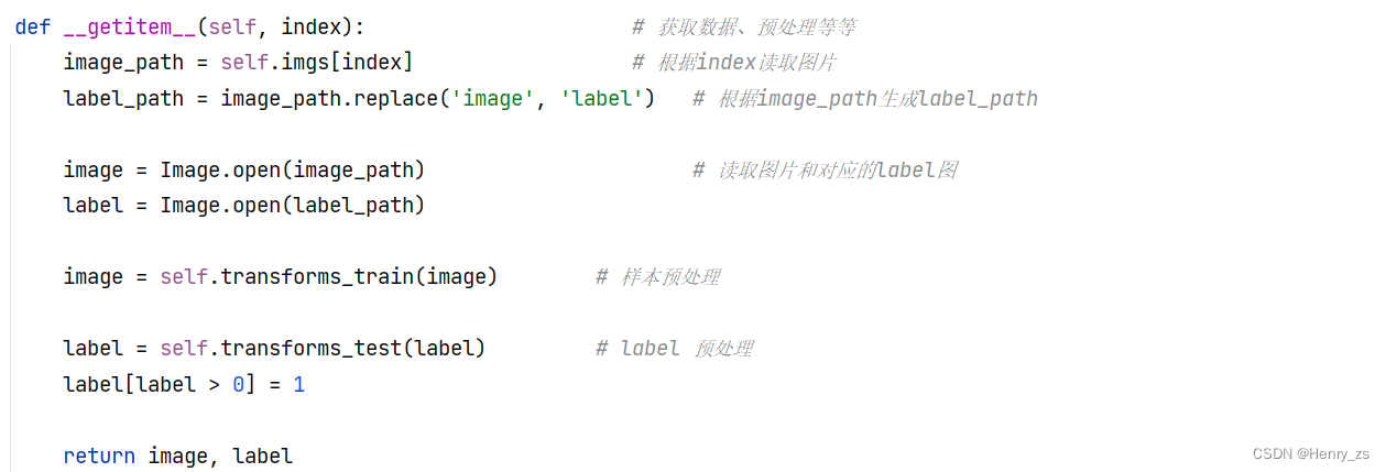 class Data_Loader(Dataset): # 加载数据def __init__(self, root, transforms_train=data_transform['train'],transforms_test=data_transform['test']): # 初始化imgs = os.listdir(root) # 读取图像的路径self.imgs = [os.path.join(root,img) for img in imgs] # 取出路径下所有的图片self.transforms_train = transforms_train # 预处理self.transforms_test = transforms_testdef __getitem__(self, index): # 获取数据、预处理等等image_path = self.imgs[index] # 根据index读取图片label_path = image_path.replace('image', 'label') # 根据image_path生成label_pathimage = Image.open(image_path) # 读取图片和对应的label图label = Image.open(label_path)image = self.transforms_train(image) # 样本预处理label = self.transforms_test(label) # label 预处理label[label > 0] = 1return image, labeldef __len__(self): # 返回样本的数量return len(self.imgs)
