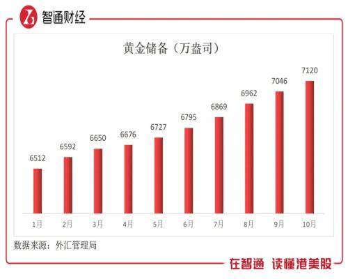 一直以来,美元一直作为外汇的重要储备,然而经济疲软下,美元的地位正在下降,各国对黄金的储备需求得到显著性提升,根据世界黄金协会,在中央银行购买黄金达到历史高位之后,各国央行仍继续对黄金持积极态度。中国持有黄金储备数量按月持续攀升,截至10月份达到7120万盎司,持有比重提升至4%。