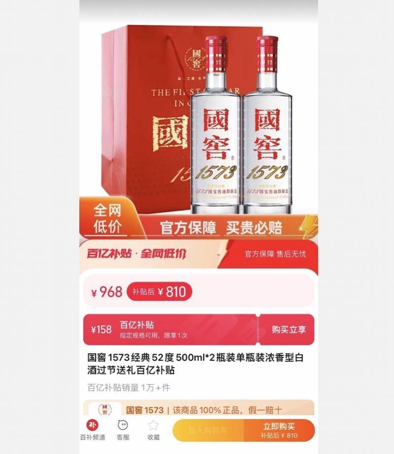 在淘宝平台,国窖1573正参与百亿补贴活动,原本的售价便已低于千元,仅售968元,这一价格已经低于其980元的出厂价,补贴后的价格更是低至810元。