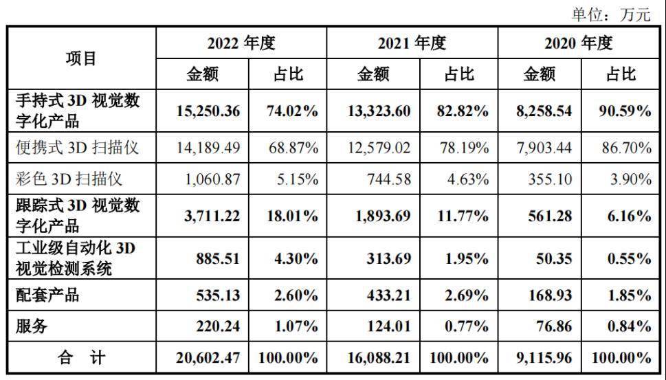 手持式3D视觉数字化产品是思看科技的主要产品,包括便携式和彩色3D扫描仪。2020-2022年,该类产品实现营收分别为0.83亿元、1.33亿元和1.53亿元,在营收逐年走高的同时,占比在逐年下降,从2020年的90.59%下降至2022年的74.02%。