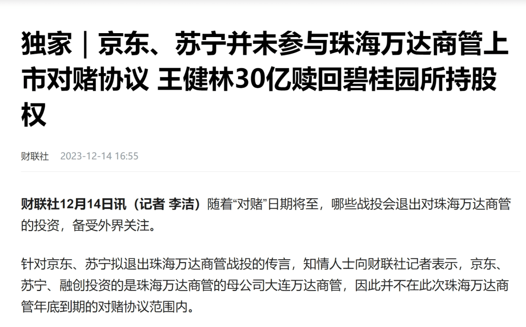 总结起来,只有碧桂园与珠海万达商管签订的协议和对赌有关,京东、苏宁和永辉超市投的都是大连万达商管,并且都不需要万达回购。