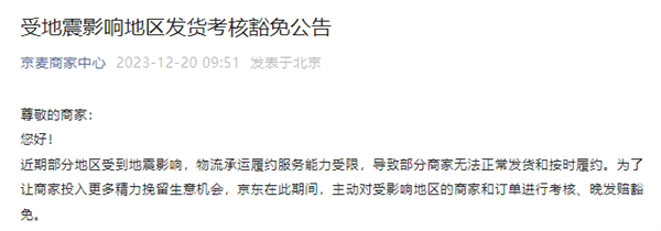 12月20日,京麦商家中心发布了公告。近期,部分地区遭受地震影响,导致物流承运履约能力受限,因此部分商家无法正常发货和按时履约。为了帮助商家集中精力争取订单,京东在这一时期主动对受影响地区的商家和订单进行考核,并豁免晚发赔偿责任。