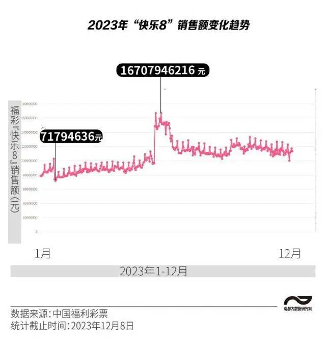 据南都大数据研究院梳理,截至12月7日,今年福彩“快乐8”已开奖327期。其中单期销售量最高达1.67亿元,出现在2023年6月13日开奖的第2023157期,相较最低值71,794,636元(第2023020期)上升了近50%。